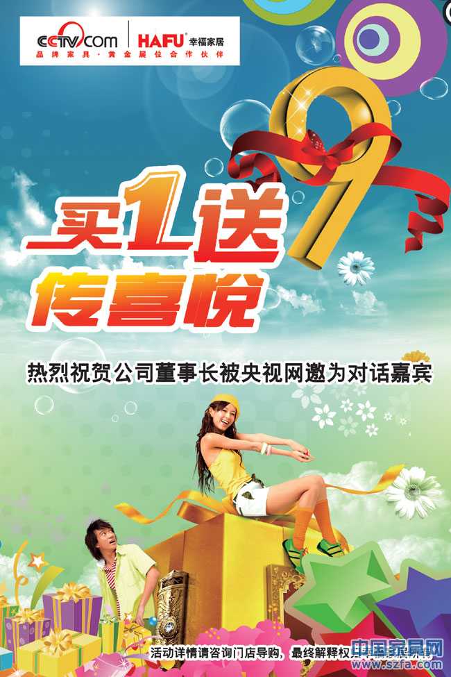 為熱烈慶祝廣州家具品牌幸福家居董事長受央視網(wǎng)榮譽邀請為對話嘉賓,現(xiàn)廣廣州家具品牌幸福家居推出“買一送九”,超優(yōu)惠活動,客戶凡在幸福家居消費滿4999元,即可享受幸福家居送出的九件實用家居禮品!機會不等人,等人的不是好機會,大家快快行動起來吧!