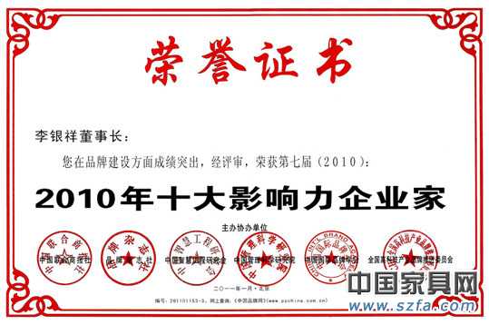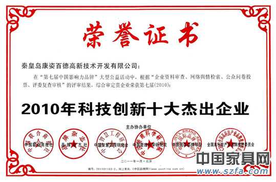 2011年1月23日,“第七屆中國品牌影響力高峰論壇年會”在北京人民大會堂隆重舉行。康姿百德憑借自身的綜合實力,榮膺“2010年十大影響力品牌”和“2010年科技創(chuàng)新十大杰出企業(yè)”。董事長李銀祥被評選為“2010年十大影響力企業(yè)家”。