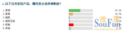 作為家居中最成熟的產(chǎn)業(yè),家電網(wǎng)購(gòu)已經(jīng)處于成熟階段,無(wú)論是官網(wǎng)還是淘寶網(wǎng),品牌家電基本都投入到網(wǎng)銷的洪流中。在此次調(diào)查中,當(dāng)被問(wèn)及聽(tīng)會(huì)選擇哪些家居產(chǎn)品網(wǎng)購(gòu)時(shí),家電毫無(wú)疑問(wèn)地以“47.2%”的高比例占據(jù)首位,而軟裝和家具分別以“19.4%”和“16.7%”的接近比例位列第二和第三。在眾多家居產(chǎn)品中,相對(duì)家電網(wǎng)購(gòu)的成熟,家具網(wǎng)購(gòu)可以說(shuō)還處于發(fā)展階段,但是可以預(yù)見(jiàn)是未來(lái)的趨勢(shì)之一.