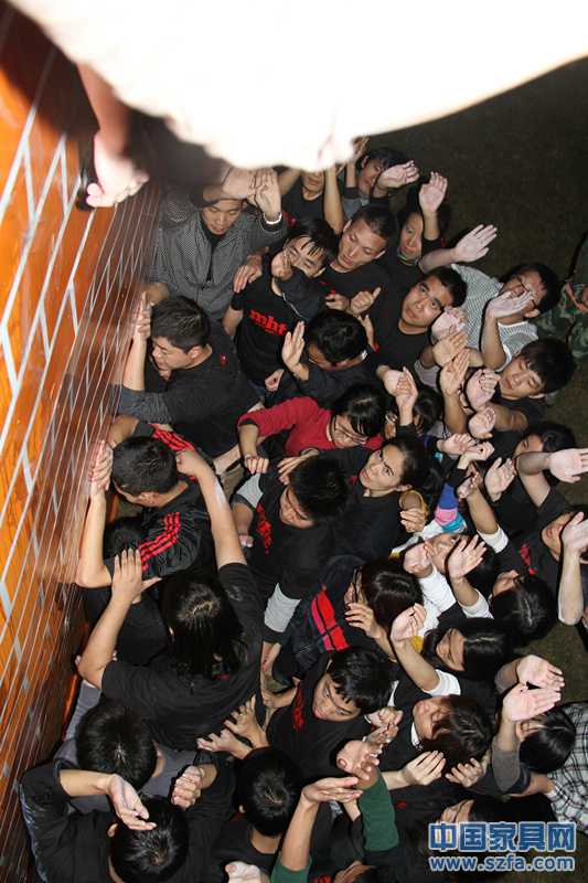 游戲規(guī)則:全隊(duì)所有成員在規(guī)定的時(shí)間內(nèi)翻越一面高4.2米的光滑墻面,在此過程中,所能用的資源只有每個(gè)人的身體,不能借助任何外界的工具。