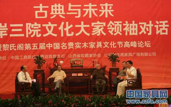 當(dāng)天下午 “古典與未來——兩岸三館文化大家領(lǐng)袖對(duì)話暨名貴實(shí)木家具文化節(jié)高峰論壇”在焦煤大廈隆重舉行,南京博物院原院長徐湖平;臺(tái)北故宮博物院原文獻(xiàn)處處長吳哲夫;臺(tái)灣文物學(xué)會(huì)理事,收藏家徐振夫;《收藏》雜志創(chuàng)始人楊才玉在現(xiàn)場圍繞文化與收藏的話題與現(xiàn)場觀眾展開了互動(dòng)訪談交流。