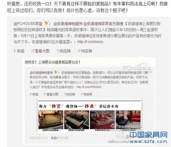 ◆◆ 不光囂張,還直接動(dòng)手打人,你下次 帶上鋼盔鐵甲維權(quán)吧!//@依諾維紳陳軍: 什么樣的人品到什么樣的企業(yè),此次維權(quán)親身體會(huì)到他們以抄襲欺詐為榮,胡說(shuō)八道,囂張至極//@FINE精制家具宋晃:支持楊總, 有些企業(yè)為抄襲而建, 以欺詐謀生, 最后必將因謊言而亡!奉勸為其打工的人及早另謀他路