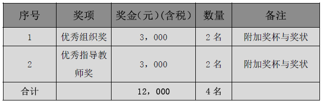 為鼓勵國內(nèi)更多的企業(yè)與院校參與此項(xiàng)活動,特為積極組織和參賽的企業(yè)與院校設(shè)立了“優(yōu)秀組織獎”,并專門針對院校組設(shè)立了“優(yōu)秀教師指導(dǎo)獎”,對那些指導(dǎo)學(xué)生參賽并獲得金、銀、銅獎的部分優(yōu)秀指導(dǎo)教師給予獎勵和鼓勵。這兩個獎項(xiàng)的具體數(shù)量和獎勵金額見下表: