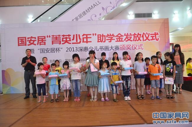 當天除了舉行助學儀式之外,惠陽國安居還舉行了2013國安居“深惠少兒書畫”比賽的頒獎儀式,儀式上頒發(fā)了金銀銅紀念獎總共50名,分別都獲得了由國安居提供的ipad2、獎杯、電子相框、精美學習用品、獲獎證書等獎品。據(jù)國安居副總鄧劍峰介紹,本次的惠陽國安居少兒書畫大賽是國安居舉辦以來人數(shù)最多,遍布最廣,評選獲獎名額最多的一次。