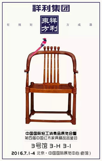 2016年7月1日-4日,祥利集團即將亮相中國國際輕工消費品展覽會暨第四屆中國紅木家具精品品鑒會,展出祥利·東方系列新中式紅木家具。(展位號:3號館3-H、3-I)