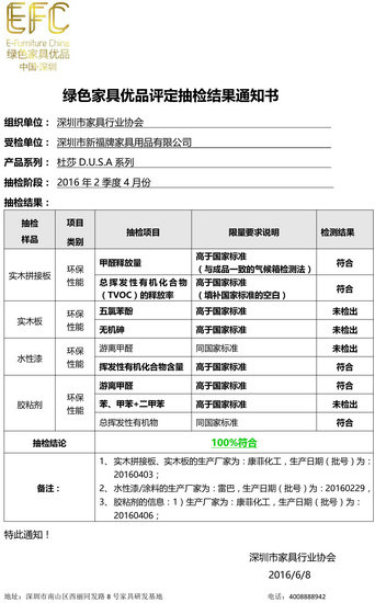 從四個(gè)月的抽檢結(jié)果來看,如游離甲醛、苯、甲苯+二甲苯、五氯苯酚、無機(jī)砷等檢測(cè)項(xiàng)目以高于國(guó)家標(biāo)準(zhǔn)檢測(cè)顯示“未檢出”。杜莎D.U.S.A系列代表了“中國(guó)綠色家具優(yōu)品”品質(zhì)標(biāo)桿。