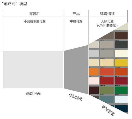 于是,開(kāi)發(fā)產(chǎn)品變成了開(kāi)發(fā)并構(gòu)筑零部件平臺(tái)。我們?cè)凇都揖咂髽I(yè)的頂層設(shè)計(jì)》與《談?wù)劥笤O(shè)計(jì)概念》等文章中所給出的“蘑菇式”模型在傳統(tǒng)成品家具企業(yè)中始終無(wú)法推廣,而有些定制家具企業(yè)卻已經(jīng)開(kāi)始認(rèn)真地執(zhí)行。
