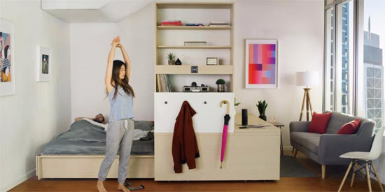 整套家具非常炫酷,無論是辦公室還是臥室,變化皆在彈指之間。哈斯?fàn)柋硎?,這套家具有床、休閑和衣柜三個模式,選擇床模式,系統(tǒng)會自動識別并與墻壁保持1.5米的距離,完全不用你動手——底部有滑輪,內(nèi)嵌的強大計算功能可以獨立完成變形。如果切換為休閑模式,床會自動收起,整套家具會為了最大限度地騰出活動空間,平移至緊貼墻壁。