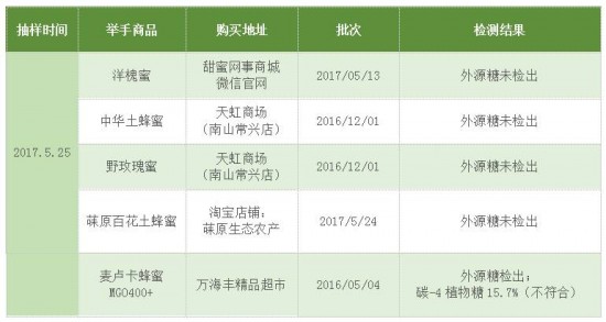 抽檢結(jié)果:除1款蜂蜜(麥盧卡蜂蜜MGO400+)檢出外源糖外,其余(善農(nóng)蜂業(yè)洋槐蜜、雪域蜂源中華土蜂蜜、蜂之源野玫瑰蜜以及菋原百花土蜂蜜)均為不摻糖的真蜂蜜。