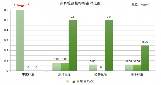 1、9家家具企業(yè)10個(gè)項(xiàng)目舉手指標(biāo)(甲醛、苯、TVOC)全部符合舉手聲明。有毒有害物質(zhì)指標(biāo)(甲醛、苯、TVOC)限量檢出值均低于國(guó)家標(biāo)準(zhǔn)、深圳標(biāo)準(zhǔn),比肩國(guó)際標(biāo)準(zhǔn)。