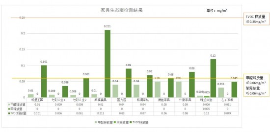 抽檢結(jié)果:松堡王國(guó)、七彩人生、路福寢具、圓方園、格調(diào)家私、德勝家具、仁豪家具、雅蘭床墊、左右家私9家家具企業(yè)10個(gè)項(xiàng)目的舉手指標(biāo)(甲醛、苯、TVOC)全部符合舉手聲明。有毒有害物質(zhì)指標(biāo)(甲醛、苯、TVOC)限量檢出值均低于國(guó)家標(biāo)準(zhǔn)、深圳標(biāo)準(zhǔn),比肩國(guó)際標(biāo)準(zhǔn)。(結(jié)果如下圖)