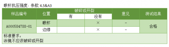第二項(xiàng)抗壓強(qiáng)度測(cè)試為使用588±2N的作用力對(duì)眼杯正面以及泳鏡邊緣施加壓力1min±5s,如果泳鏡破裂則視為不合格,而本次測(cè)試結(jié)果完全達(dá)到歐盟標(biāo)準(zhǔn)。