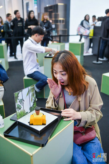 大城小食,展位上熙熙攘攘的人群都想嘗一口深圳。臺灣知名設(shè)計師曾熙凱聯(lián)合策劃“The Food & City•大城小食”創(chuàng)意設(shè)計,用食物設(shè)計的方式向世界傳達深圳故事、深圳文化和深圳精神,讓世界看到深圳的無限創(chuàng)意和活力。以食物做成家具部件,以餐盤作為房間地板,觀眾可以現(xiàn)場將各種部件組合,自由創(chuàng)造出屬于自己的家具,詮釋自我風(fēng)格,最后一口一口吃掉。