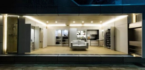 空間變身:從左到右分別為衛(wèi)生間、臥室、起居室。迷你廚房被安置在櫥柜中,被回旋推拉門隱藏。