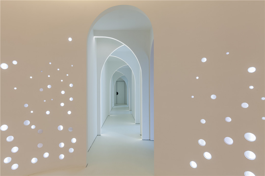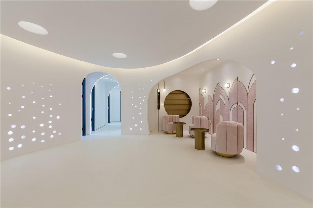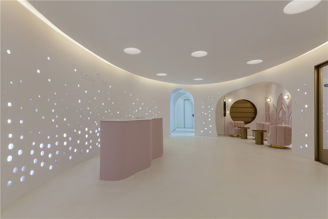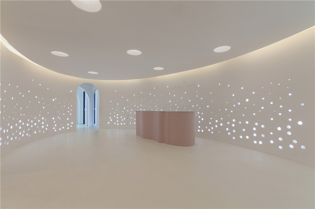本次獲獎作品《lady mooi 女子醫(yī)療美容機(jī)構(gòu)》其靈感源自兩歲女兒的睡前故事,設(shè)計摒棄了以往該類型空間所采用的慣常的符號化做法,以“人魚公主”的故事為設(shè)計靈感,提取氣泡、水等夢幻元素,營造輕松、舒適、浪漫的環(huán)境,讓愛美的顧客們在這里有仿佛置身夢幻水世界的感受。一圈沖孔板從下往上、由大到小不規(guī)則排列,仿佛海底世界的氣泡,簇?fù)沓扇彳?、純凈的橢圓形空間。過道用燈帶鑲嵌半弧形攻門,錯落之間,一步一世界,那份變身的莊重在魔法的推演中漸漸實(shí)現(xiàn)。