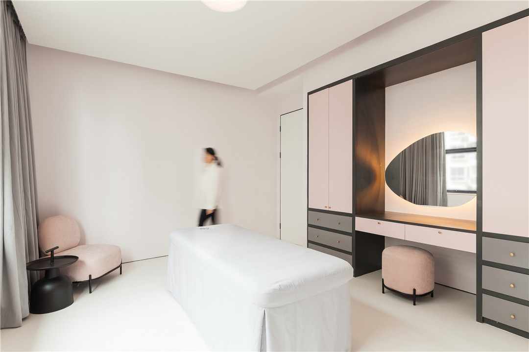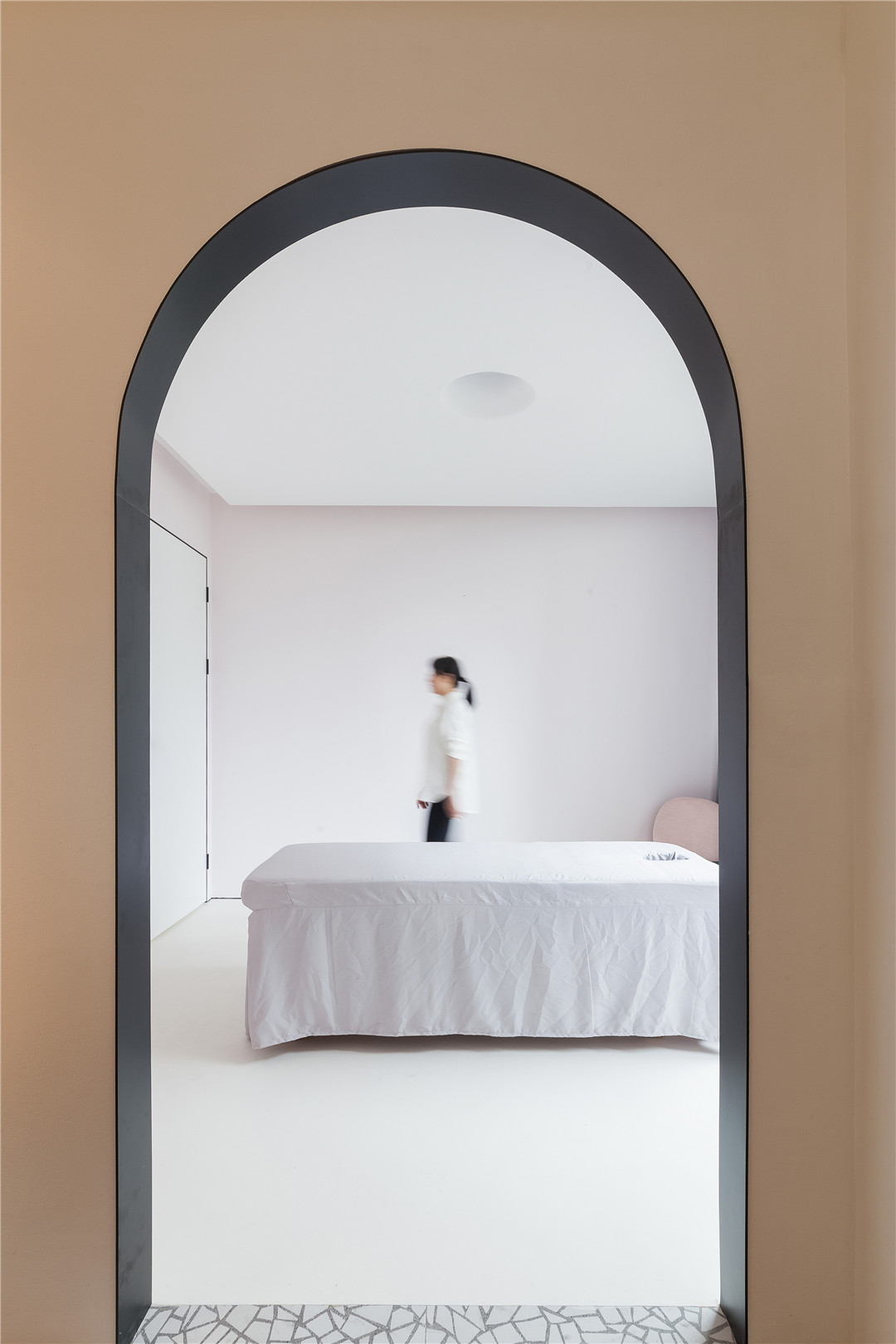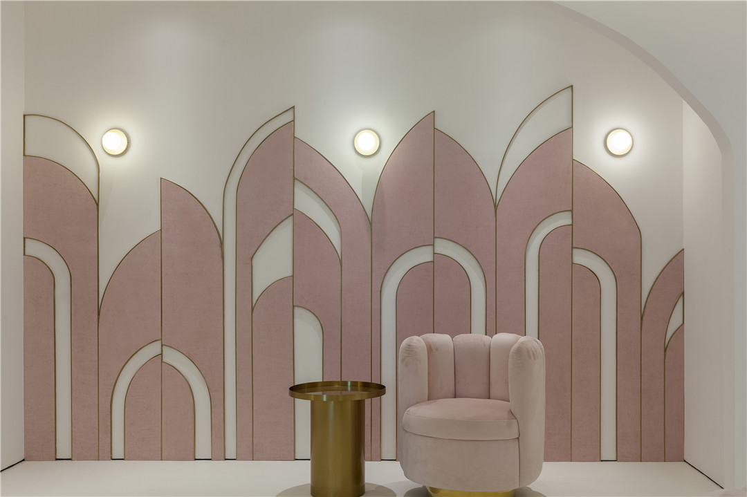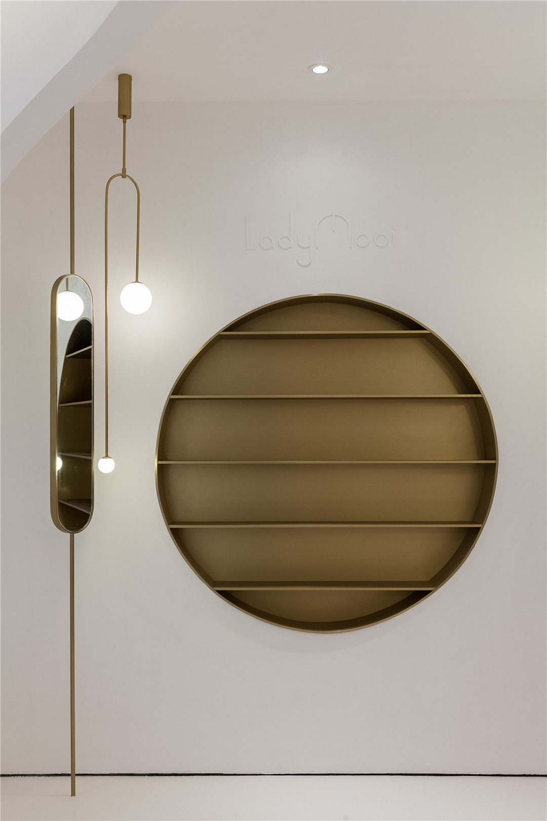 本次獲獎作品《lady mooi 女子醫(yī)療美容機(jī)構(gòu)》其靈感源自兩歲女兒的睡前故事,設(shè)計摒棄了以往該類型空間所采用的慣常的符號化做法,以“人魚公主”的故事為設(shè)計靈感,提取氣泡、水等夢幻元素,營造輕松、舒適、浪漫的環(huán)境,讓愛美的顧客們在這里有仿佛置身夢幻水世界的感受。一圈沖孔板從下往上、由大到小不規(guī)則排列,仿佛海底世界的氣泡,簇?fù)沓扇彳?、純凈的橢圓形空間。過道用燈帶鑲嵌半弧形攻門,錯落之間,一步一世界,那份變身的莊重在魔法的推演中漸漸實(shí)現(xiàn)。