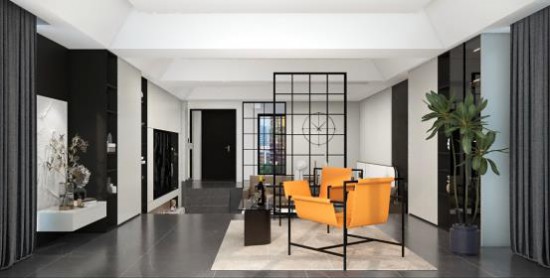 黑白灰的空間里加點(diǎn)亮色調(diào)和,客廳的整體基調(diào)更加和諧統(tǒng)一,臺(tái)階設(shè)計(jì)讓整體格局形成高低差觀感,更顯生動(dòng)性與趣味性,劃分區(qū)域,同樣不失互動(dòng)性。