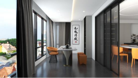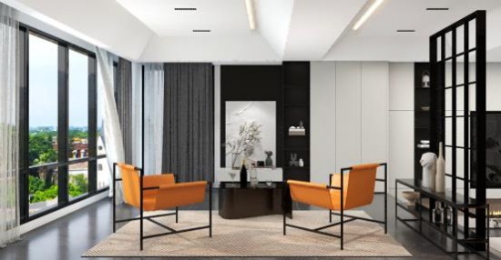 落地窗引景入室,兩張CBD家居·金豹 | J001單椅,愛(ài)馬仕橙色洋溢時(shí)尚氣息,構(gòu)型線條感十足,將藝術(shù)與實(shí)用性完美結(jié)合,穩(wěn)固性俱佳。風(fēng)動(dòng)簾,可靜坐望遠(yuǎn),享受愜意時(shí)光。