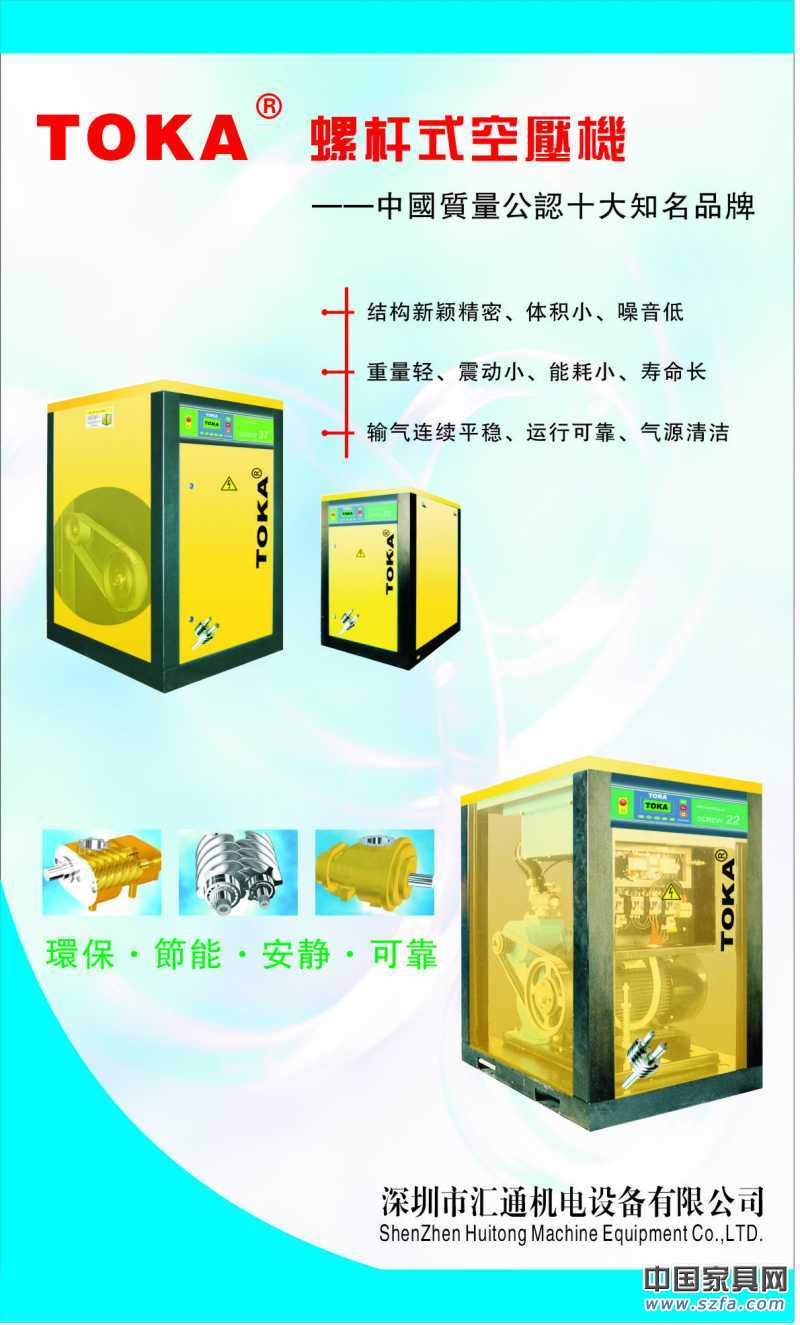 公司設(shè)計(jì)、銷售的主要產(chǎn)品有:TOKA®(特高)牌螺桿式空壓機(jī)、活塞式空壓機(jī)、儲氣罐、冷凍式干燥機(jī)、吸附式干燥機(jī)、過濾器等設(shè)備;設(shè)計(jì)制造:車間水簾負(fù)壓降溫工程、不燒油不燒電的企業(yè)熱水工程。TOKA®牌空壓機(jī)被評為2007年中國質(zhì)量公認(rèn)十大知名品牌。