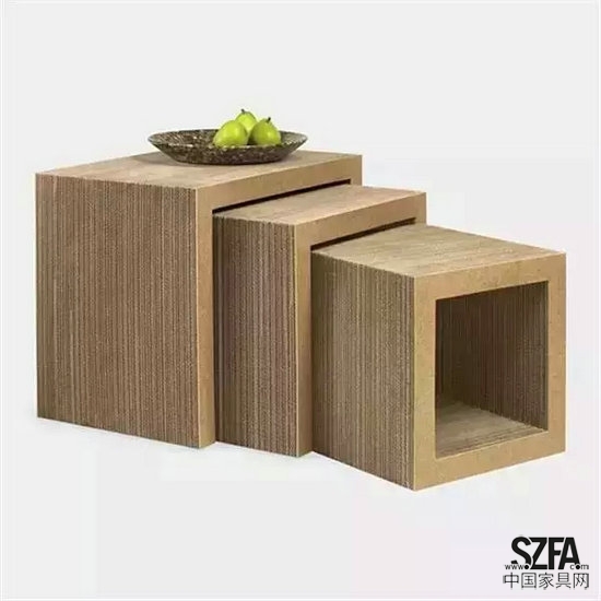 一把椅子,一個腳踏(兼具雜志架功能),一個茶幾,用多層瓦楞紙切割而成,拆卸、組合都非常方便,節(jié)省空間。