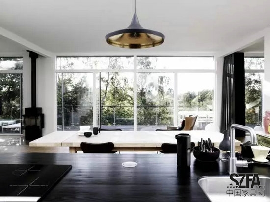 設(shè)計(jì)師對于色彩的把握張弛有度,素色、黑白、彩色都融合在空間中,簡潔卻豐富。加上室外綠蔭環(huán)繞的美麗景色,自然主義貫穿室內(nèi)外,最舒適怡人的居所總是與自然緊密相連。