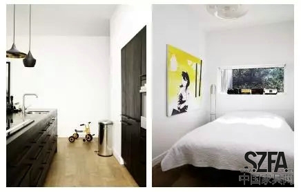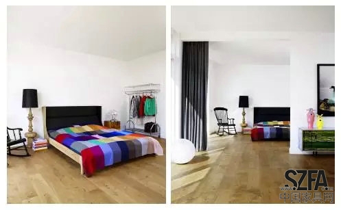 整個室內(nèi)空間非常寬敞,完全素凈的墻面和純木地板有種一目了然的干凈和純粹,彩虹版塊的被單讓整體的色彩跳躍起來。