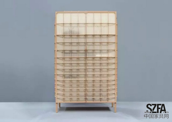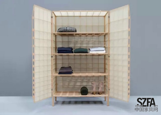 這是由荷蘭設(shè)計(jì)師 Mieke Meijer 設(shè)計(jì)的衣柜,他從 20 世紀(jì)早期飛機(jī)機(jī)翼中獲得的靈感。柜子的表面像是有無(wú)數(shù)小方格,其實(shí)是用帶孔的橡木板搭建的,中間串上鋼絲繩固定,從中間打開后就有木質(zhì)機(jī)翼的輕盈感。里面的隔間也是用帶孔的橡木板,很透氣。它的重量只有 18.5 千克,方便移動(dòng)。