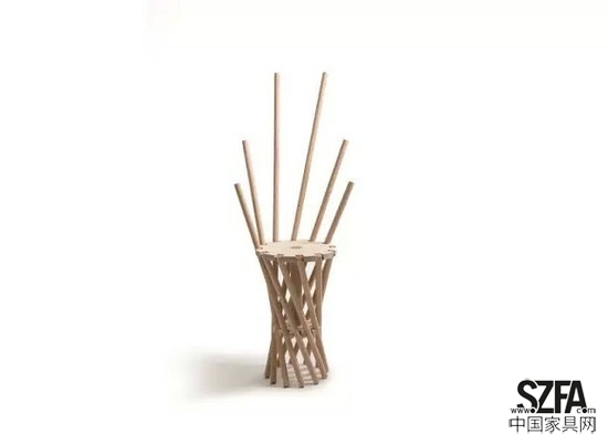 紐約設(shè)計(jì)師 jongyoon choi 用 12 根木棍和兩塊激光切割的圓板組成了這把椅子,巧妙的是它們沒(méi)有使用釘子之類的物品固定,而是將木棍傾斜,插進(jìn)木板的空缺,以此達(dá)到一種巧妙的平衡。如果木棍完全切割成一樣的長(zhǎng)度,它就是一把凳子。所有木棍按照一個(gè)方向傾斜,讓它有了律動(dòng)和旋轉(zhuǎn)的感覺(jué),很活潑。但總覺(jué)得更適合放在服裝商店的角落做裝飾。