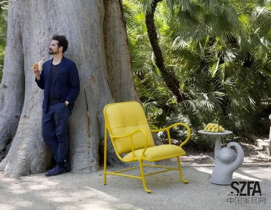 Jaime Hayon用猴子邊桌更新gardenias作品(中間的黃色椅子),在2015年米蘭家具展上展出,“猴子”邊桌用固體建筑混泥土制作而成,與周邊環(huán)境很好地相融合,猴子的可愛造型又給空間增添了活潑感。(邊桌:可以用來備餐及擺放餐具的桌子,而且可以起到美化裝飾以及隔斷作用)