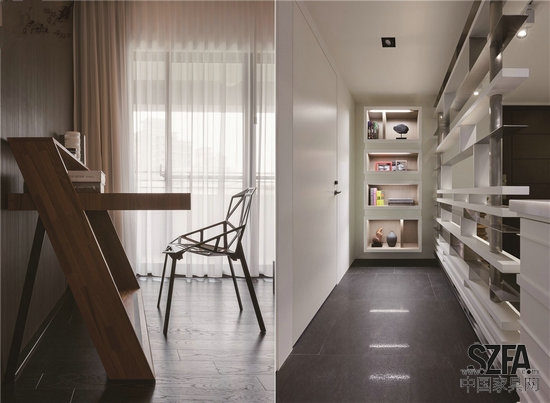 設(shè)計(jì)團(tuán)隊(duì)為這間單元住宅的中央打造出一處富有“茶藝”氛圍的品茶區(qū),極具藝術(shù)感,在這里,居住者可以一邊品茶,一邊欣賞室內(nèi)各空間的裝潢景致,同時(shí),也為觀賞未來(lái)的公園綠化景致提供了最為理想的視角;此外,它也實(shí)現(xiàn)了室內(nèi)與戶外視覺(jué)的自然過(guò)渡,是宅內(nèi)一處適合于放松、社交、互動(dòng)和休息的區(qū)域。品茶區(qū)空間以木質(zhì)材料裝潢,其藝術(shù)視覺(jué)觀感強(qiáng)于宅內(nèi)的其他各處,同時(shí)也賦予這間現(xiàn)代單元住宅以些許寧謐的自然之感。同樣質(zhì)地的木材紋路還被用于壁紙的裝飾中,而染色玻璃墻體和相應(yīng)的軟質(zhì)材料則都有著良好的光滑度,以保持室內(nèi)裝飾紋理的視覺(jué)平衡。